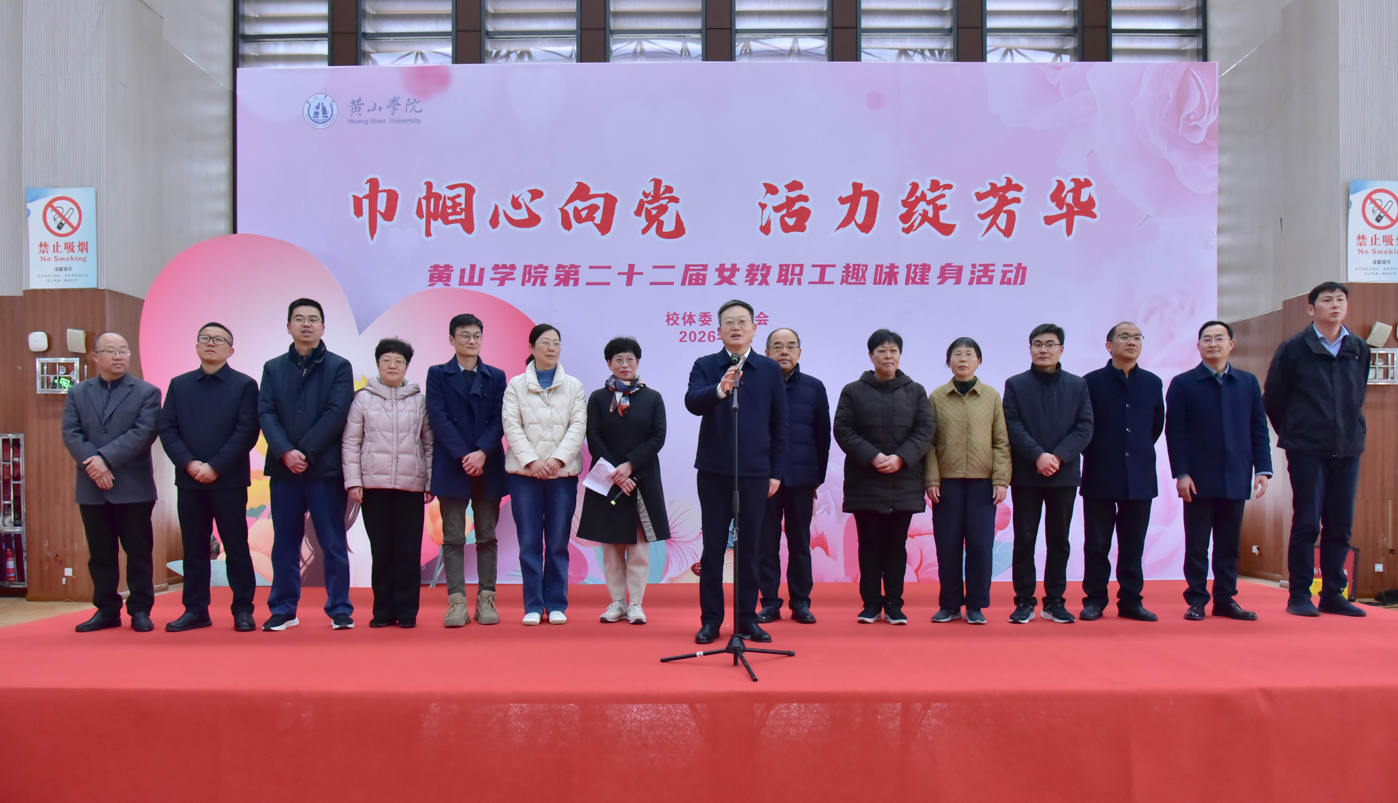 阳春三月,徽韵飘香,巾帼齐聚绽芳华。为庆祝第116个“三八”国际劳动妇女节,3月4日下午,校体委、校工会联合举办的 “巾帼心向党 活力绽芳华”第二十二届女教职工趣味健身活动,在率水校区风雨操场二楼体育馆举行。校党委副书记刘力,校党委委员、副院长、体委主任张小明出席开幕式,校体委委员、工会委员会委员、分工会主席及400余名女教职工参加活动。