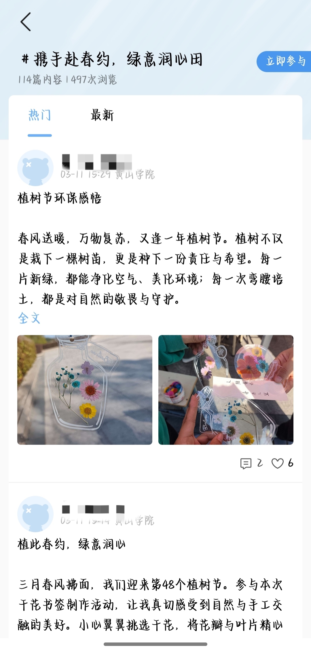 活动以创意书签制作与线上互动相结合的形式,引导青年学子在实践中感受绿色力量、传递环保理念。在创意书签制作环节,参与师生用彩笔在便签上写下植树节环保宣言与感悟,搭配干花片与塑封膜制作成精美书签,让绿意与心意永久留存。线上环节,大家浏览“植此春光”轻应用并参与互动交流,让绿色理念在校园广泛传播;同时将线下手工作品拍照、撰写感悟,发布带有“携手赴春约,绿意润心田”话题的易瞄瞄动态,并将相关过程图片上传至易班优课在线作业。