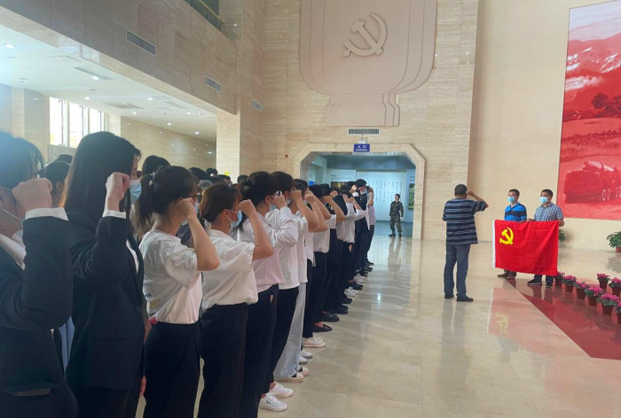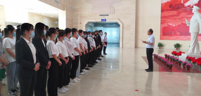 建党百年迎华诞,红心向党铸信仰。为进一步厚植广大学生党员的爱党爱国情怀,坚定入党初心和为共产主义奋斗终身的决心,坚定永远跟党走的政治信念,6月16日下午,旅游学院在杨业功纪念馆庄严举行新党员入党宣誓仪式,旅游学院党委书记陶卫平,党委副书记、纪委书记孙克奎,党委委员、副院长姚李忠,各党支部书记及全体新发展党员出席此次活动。入党宣誓仪式由孙克奎主持。