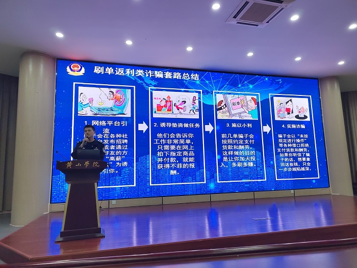 培训现场,屯溪公安分局反电诈中心、黎阳派出所民警分别结合刷单返利、冒充客服退款、冒充熟人、网络游戏账号交易、虚假购物服务、虚假兼职等针对大学生的典型诈骗类型进行宣讲,用通俗易懂的语言,向在场师生详细讲解了常见骗局的作案手法、特点及防范技巧,揭露诈骗分子的惯用套路,提醒师生时刻保持警惕。培训结束后,反诈志愿者给师生发放宣传资料、讲解防骗要点,确保宣传走深走实、见行见效。此次反诈宣传进校园活动,紧贴实际,有效提升了我校师生的自我防范意识和辨别诈骗的能力。