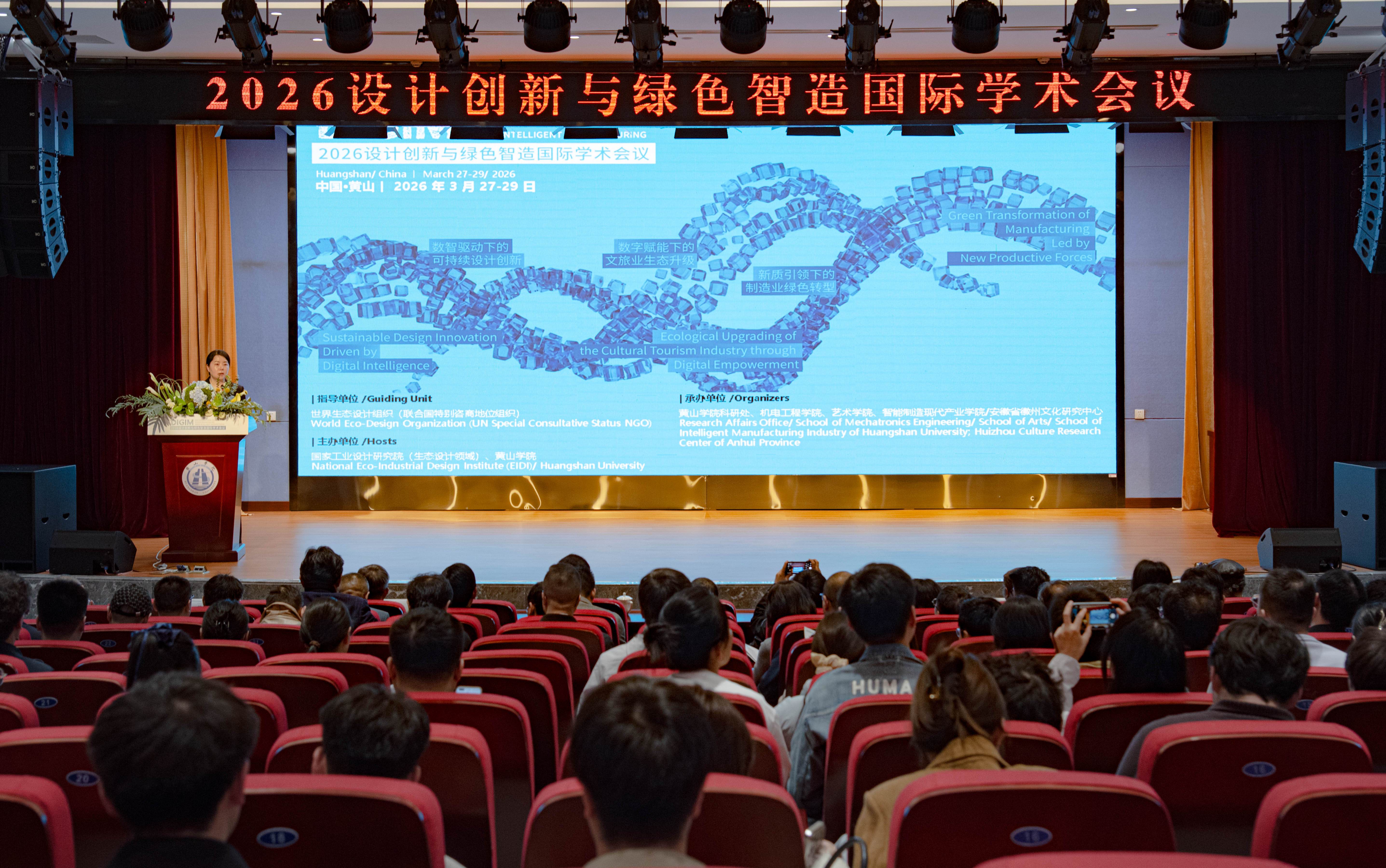 3月28日至29日,由世界生态设计组织(联合国特别咨商地位组织,WEDO)指导,国家工业设计研究院(生态设计领域)与黄山学院联合主办的2026设计创新与绿色智造国际学术会议(DIGIM 2026)在我校举办。同期召开了首届“设计·生态”全国设计院校院长圆桌论坛(NRFDD 2026)。本次大会聚焦数字化转型与可持续发展,各业界、学界嘉宾及学者齐聚一堂,共同探讨数智技术赋能设计创新与绿色智造驱动产业转型的创新路径。