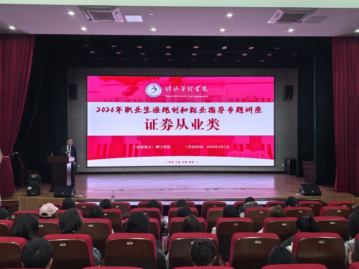4月1日下午,经济管理学院2026年证券从业类职业生涯规划和就业指导专题讲座在横江校区报告厅举办。诚邀中泰证券安徽分公司黄山营业部总经理陈青华担任主讲人。学院近300名师生参加讲座。