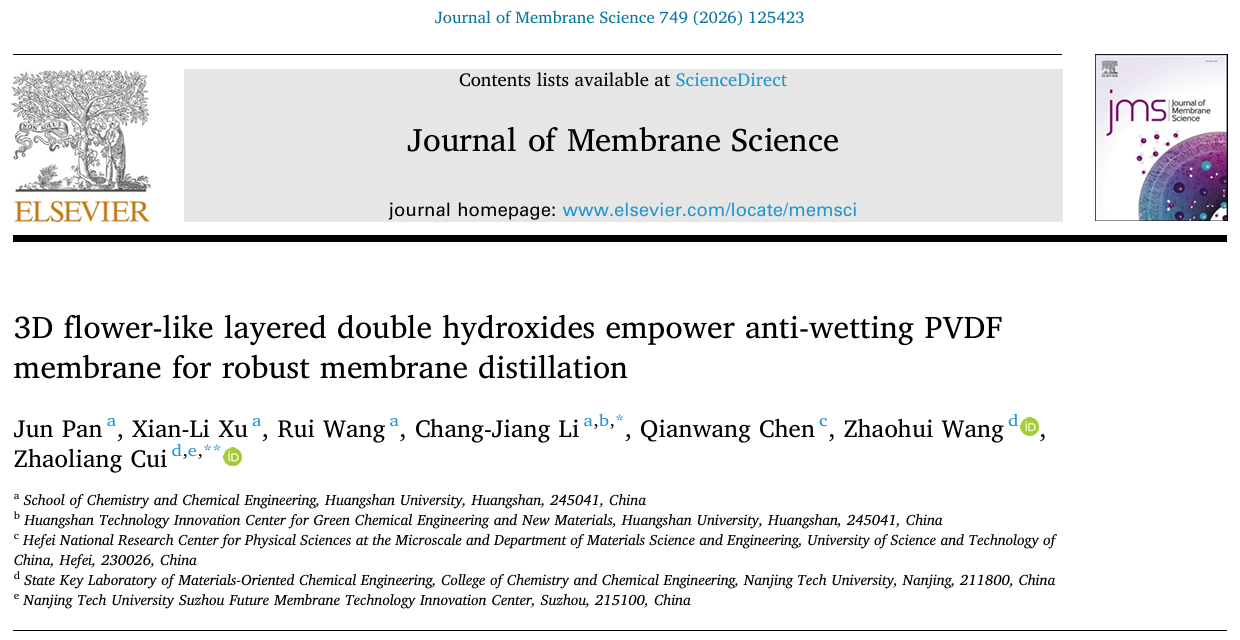 近日,我校化学化工学院科研团队联合南京工业大学在膜分离领域权威TOP期刊《Journal of Membrane Science》(IF=9.0,中科院一区)上发表原创性科研论文,《3D flower-like layered double hydroxides empower anti-wetting PVDF membrane for robust membrane distillation》(3D花状层状双氢氧化物增强型抗润湿PVDF膜用于膜蒸馏过程)。该成果以黄山学院为第一完成单位,论文第一作者为我校化学化工学院青年教师潘俊博士,通讯作者为我校李长江教授、南京工业大学崔朝亮教授。本研究得到黄山学院高层次人才启动基金(2025xkjq004,2024xkjq026)、安徽省青年教师培养项目(DTR2023046)等项目的资助。