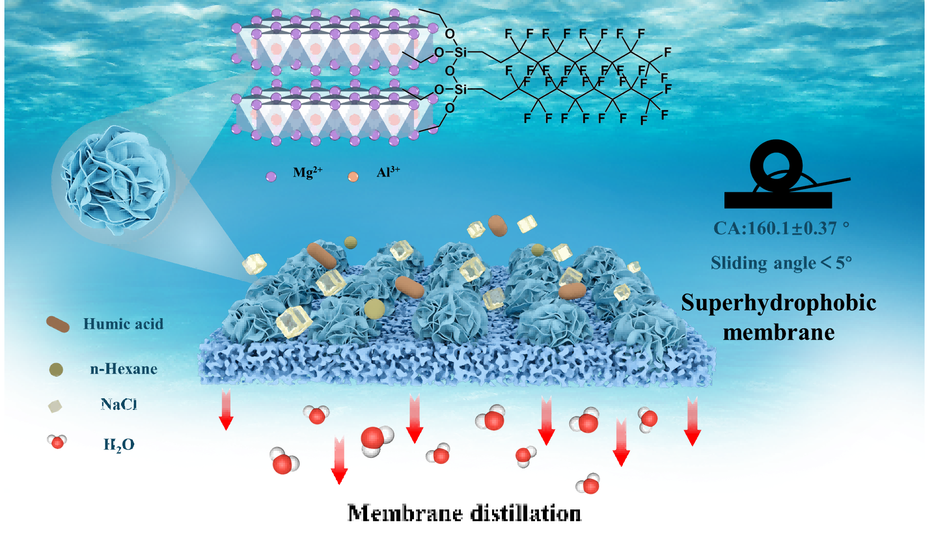 膜蒸馏技术借助多孔疏水膜,以膜两侧的饱和蒸气压差作为驱动力,可从海水、工业废水等含盐溶液中回收淡水资源。然而,膜润湿问题是制约该技术进一步发展的瓶颈。为克服这一限制,研究团队首先在聚偏氟乙烯(PVDF)基膜表面构筑了三维纳米花状的层状双金属氢氧化物(LDHs)结构,实现表面粗糙化,并通过进一步降低膜表面能,成功制备出超疏水复合膜(静态水接触角>160o,滚动角为4.67o)。该复合膜在膜蒸馏处理不同浓度(0.6M、3M)氯化钠、腐殖酸以及正己烷等溶剂时,均展现出长期稳定的渗透、分离性能,全程未发生膜润湿。此外,本研究构建并详细阐明了界面抗润湿模型与机理,为超疏水膜的制备以及膜蒸馏的长期稳定运行提供理论支撑与重要参考。