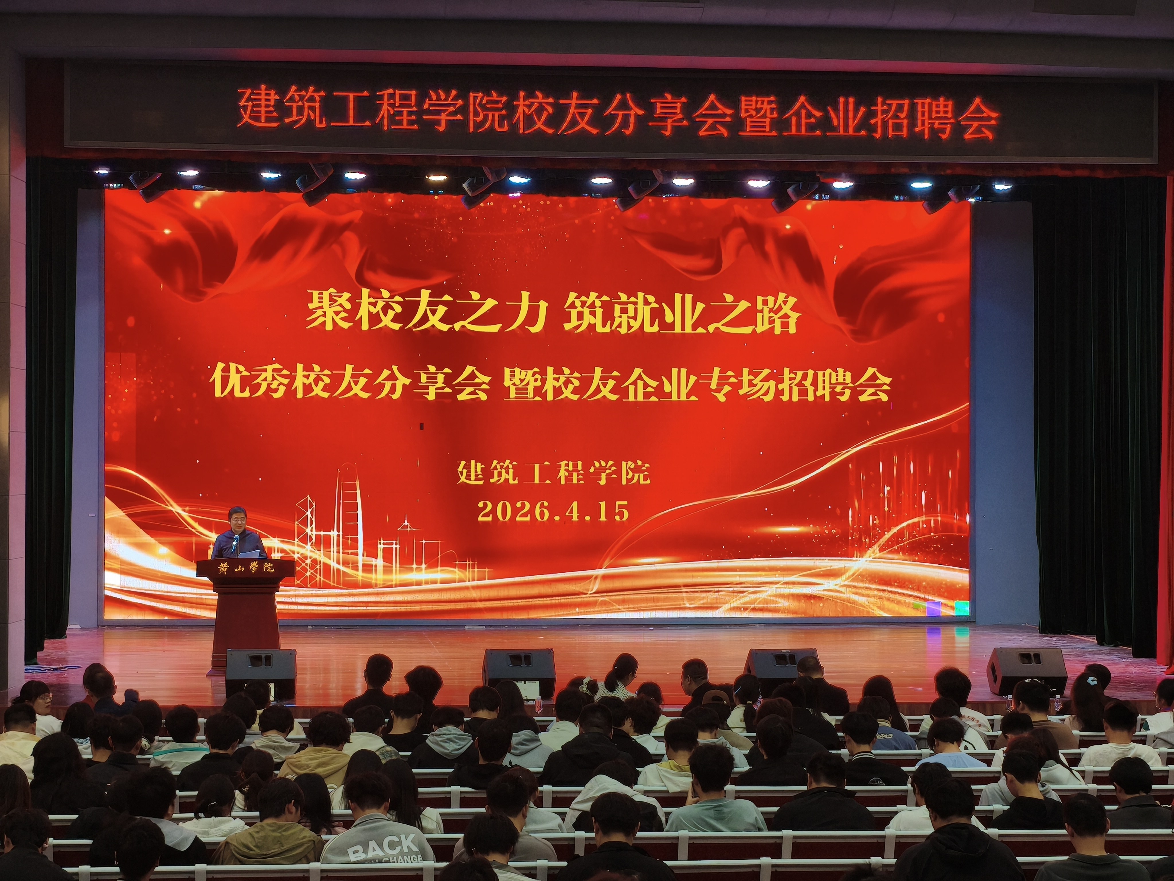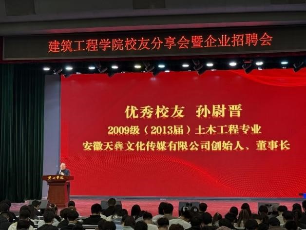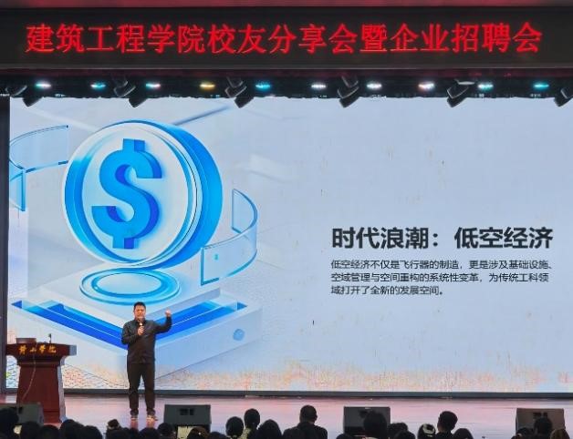 分享环节,建筑工程学院以及兄弟学院师生共约700余人参加。两位校友结合自身跨界发展与创业实践经历,为学子们带来一场兼具思想性、实践性与指导性的职业分享。孙尉晋校友结合企业发展实际,分享从土木工程专业跨界深耕直播行业的创业历程与成长感悟,鼓励同学们勇于突破专业局限,抢抓时代机遇,勇于创新、敢闯敢为。陈剑校友立足低空经济新兴领域,紧密结合学院专业特色,深入阐释低空经济与学院四大专业的融合发展、产业前景及人才需求,为同学们职业规划与转型发展提供精准指引。分享结束后,校友与同学们深入互动交流,现场提问踊跃、氛围热烈,充分展现了校友与学弟学妹之间的真挚情谊与良好学风。