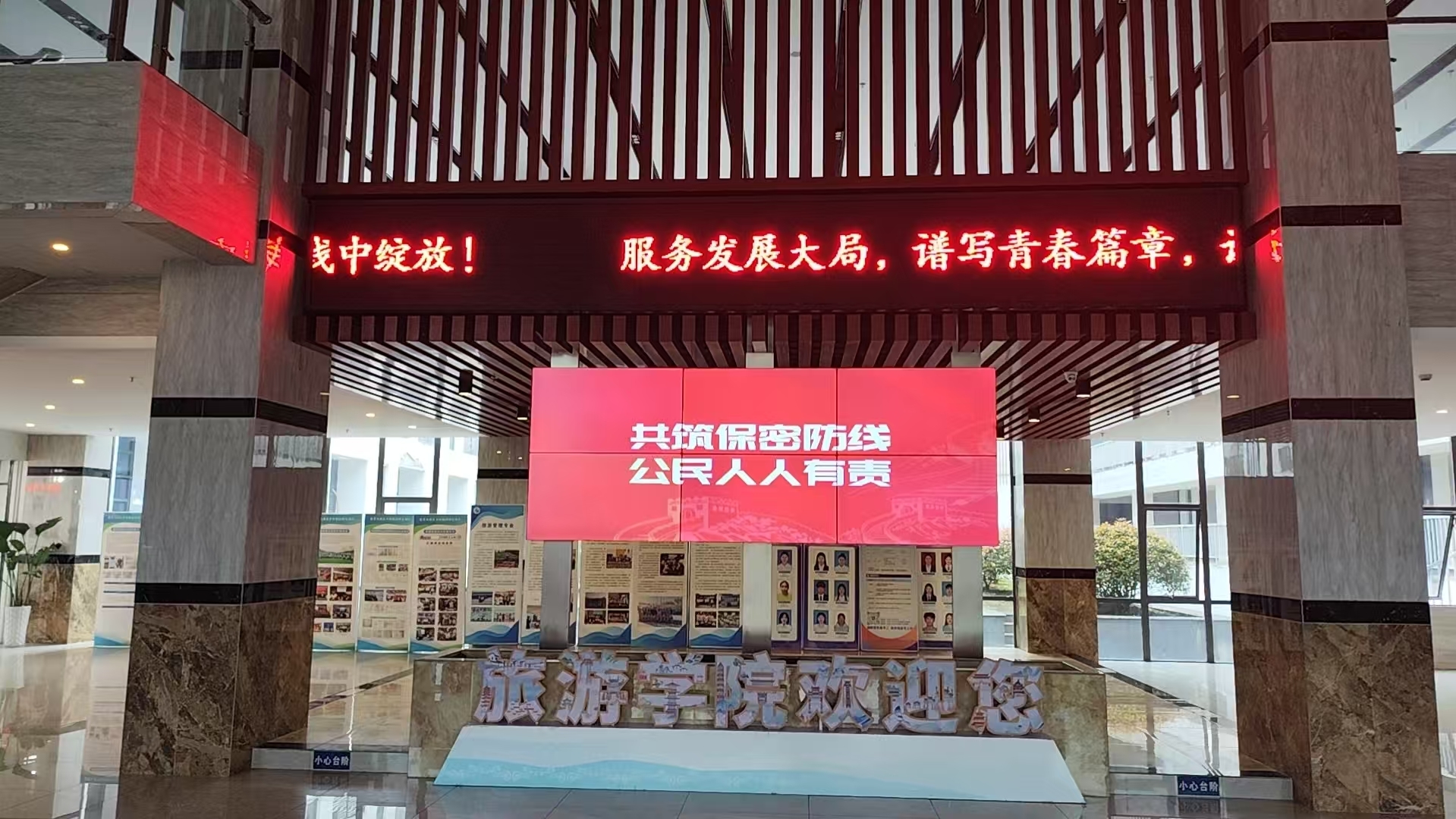 线下场景营造浓厚氛围。在率水、横江两校区食堂、教学楼、主干道等人流密集区域,我校以展板巡展、主题海报、LED 屏滚动播放标语等形式,直观阐释总体国家安全观核心内涵,用鲜活案例警示安全风险,让“国家安全、人人有责、人人可为”的理念融入校园日常。