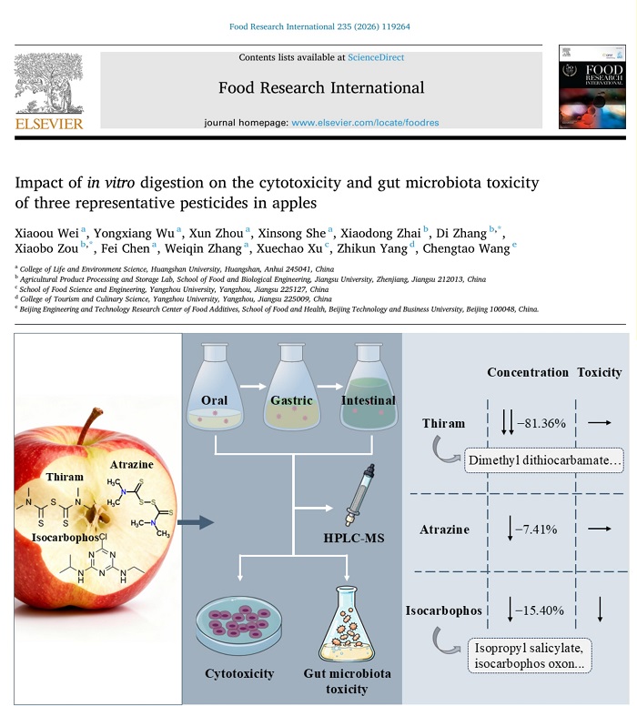 近日,我校生命与环境科学学院食品科研团队在食品科学领域TOP期刊《Food Research International》(IF 8.5,中科院一区)发表原创研究论文《Impact of in vitro digestion on the cytotoxicity and gut microbiota toxicity of three representative pesticides in apples》(体外消化对苹果中三种代表性农药的细胞毒性及肠道菌群毒性的影响)。该成果以我校为第一完成单位,论文第一作者为我校生命与环境科学学院魏晓鸥博士,共同作者包括吴永祥教授、周讯博士、佘新松教授、陈飞博士、张唯勤博士等,通讯作者为江苏大学邹小波教授、张迪教授。本研究得到黄山市科技计划项目(2025Z-17)、黄山学院人才启动项目(2024xkjq019)、安徽省高校协同创新项目(GXXT2023053)等项目的资助。