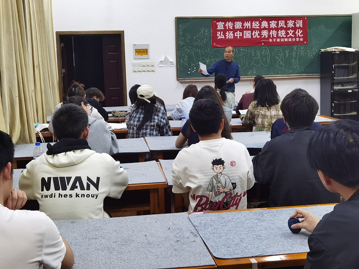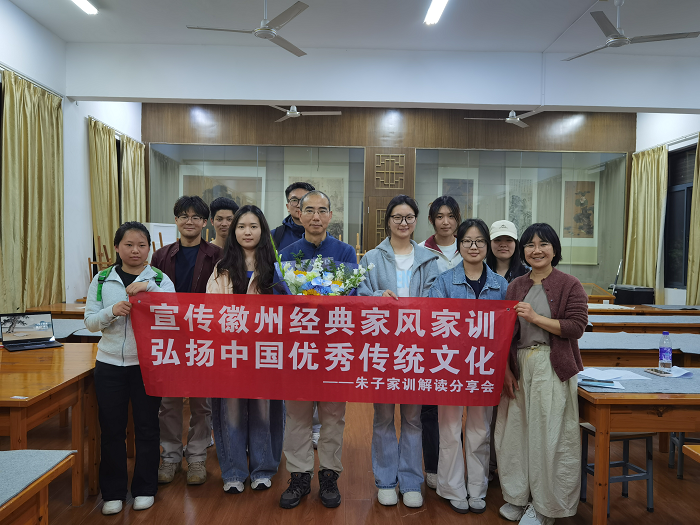 为深入挖掘中华优秀传统文化中的家风家训智慧,传承弘扬优良家风美德,涵养青年学子的精神品格。近日,黄山学院大学生书画社团举办“朱子家训润心田,家风传承启新篇”主题解读分享会,由汪老师带领社团成员一同品读《朱子家训》,感悟其中的修身之道与治家智慧。
