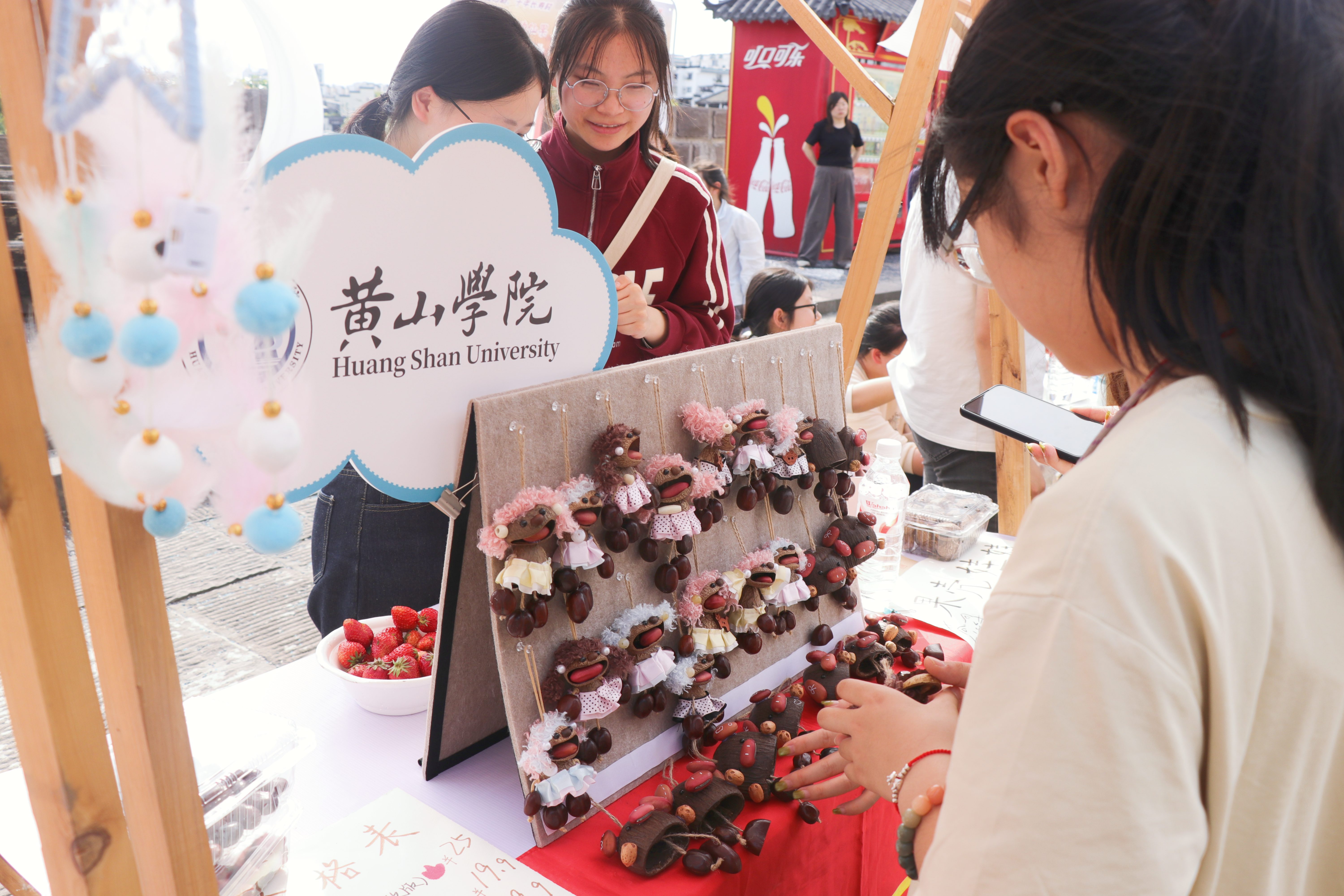 各社团各展所长。徽州学社研发的草本中药香囊融合徽州非遗民俗与日常实用需求,古法配比,成为全场热销爆款;书画协会社员现场即兴创作书法篆刻、写意书画,尽显传统笔墨魅力;剪纸协会精工雕琢民俗主题剪纸,展现皖南非遗独特韵味;艺创手工坊自主原创国风纹样,纯手工制作天然文创香皂;素质拓展协会巧用天然果核雕琢呆萌果核小人玩偶,造型灵动;泉漫画社准备了定制拼豆及精美免费小礼品;乡村振兴协会严选黄山本地原生态农特优品,助力乡土好物出圈;青年志愿者协会手工DIY原创扇子,并设置互动体验环节,邀请游客沉浸式参与,提升文旅互动感。