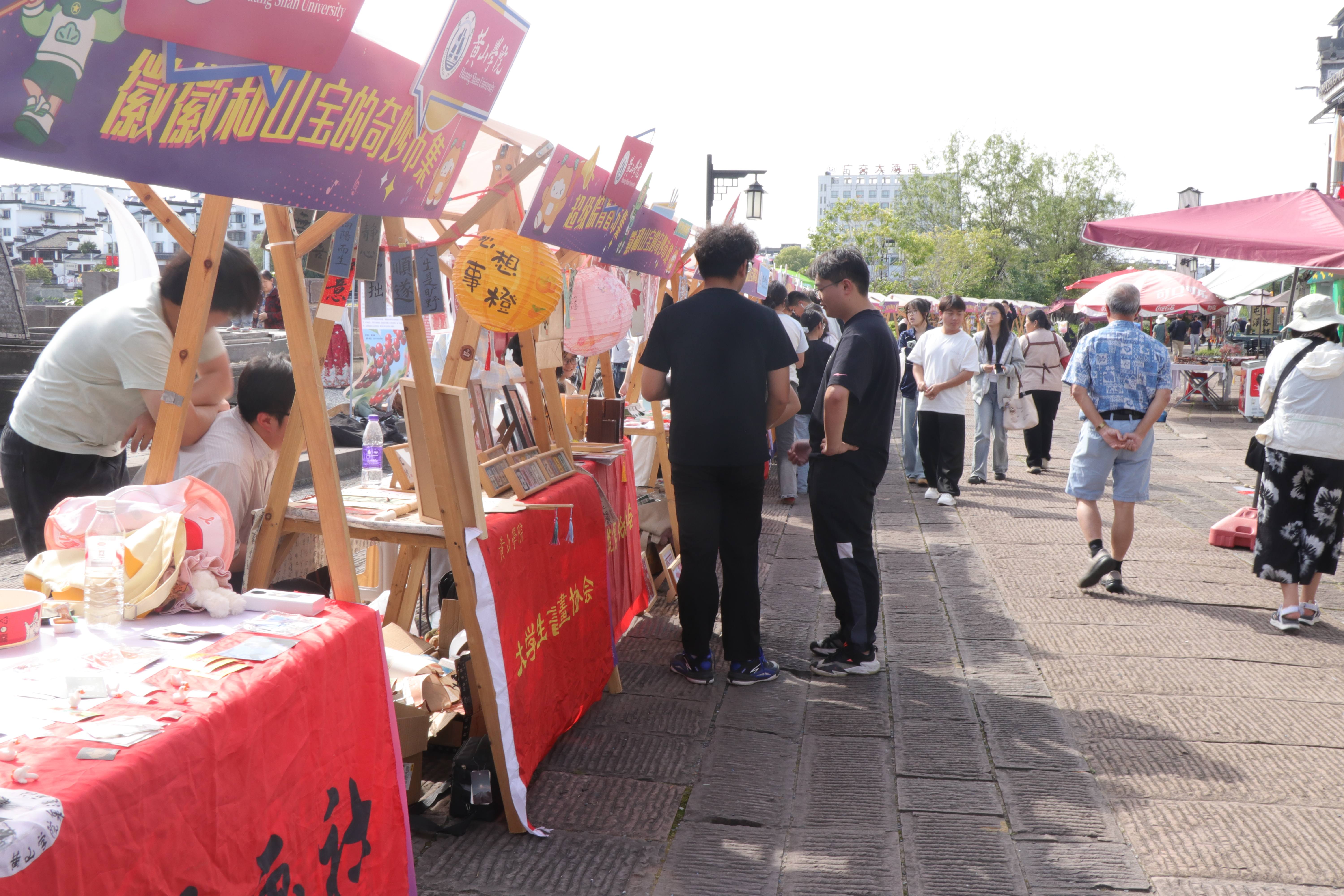 4月25日至26日,“2026黄山青年生活季”主题市集活动在屯溪河街顺利举行。为深入推进实践育人工作,搭建校外优质实践平台,引导社团走出校园、接轨市场,我校统筹组织特色学生社团集体入驻本次活动,设立十个专属创意展位,展示青春风貌,推介原创文创产品,成为市集中极具青春特色的打卡点。