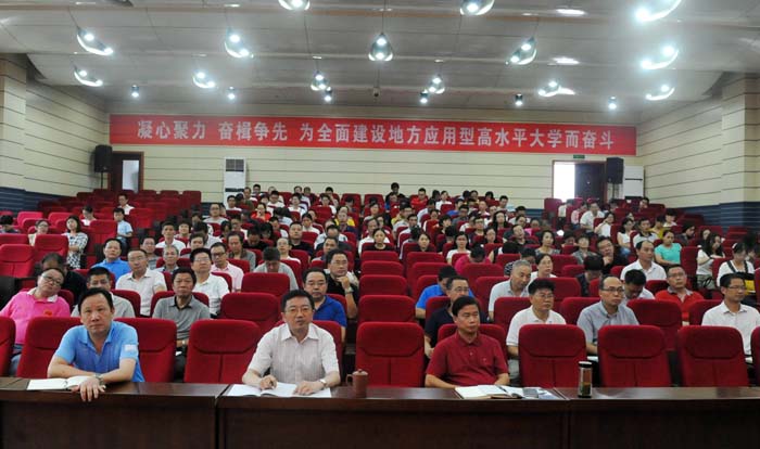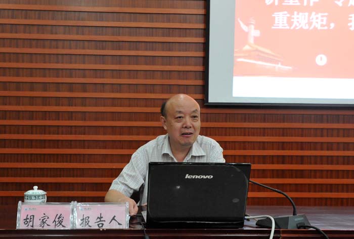 为深入推进“两学一做”学习教育常态化制度化,扎实开展“讲政治、重规矩、作表率”专题教育, 9月19日下午,我校在逸夫图书馆二楼报告厅举办专题党课报告会。校党委委员、副校长胡家俊作题为“重规矩,我们怎么做”的党课报告。党委书记汪枫,副校长胡善风,党委委员、副校长刘英旺出席会议;党委委员,全体处级干部,全体科级党员干部,各部门全体党员,艺术学院、教育科学学院全体教工党员参加报告会。汪枫主持报告会。