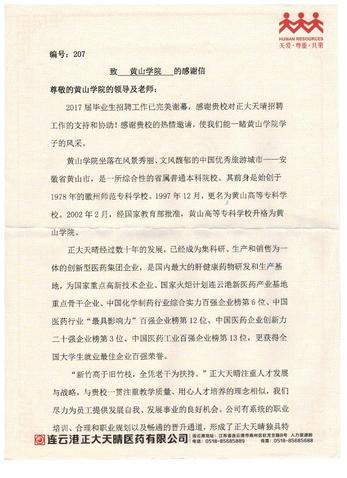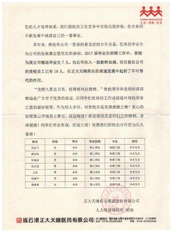 近日,江苏连云港正大天晴药业集团股份有限公司致函我校,感谢我校为该公司输送大量优秀毕业生。