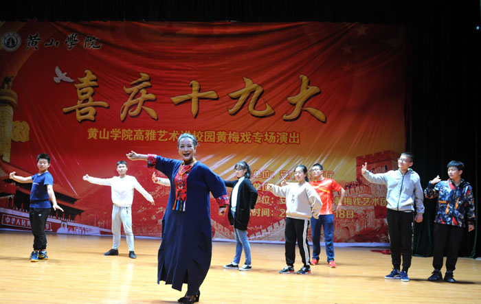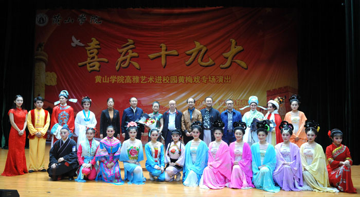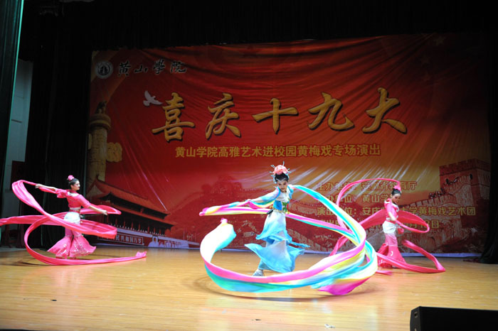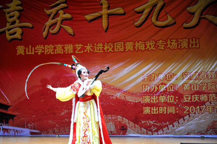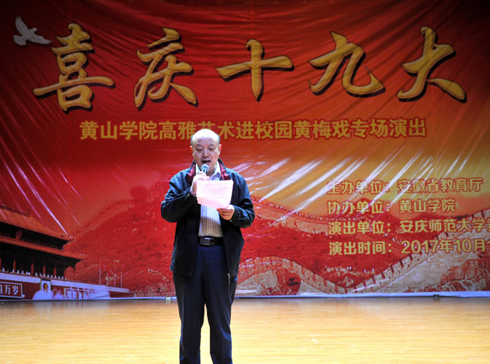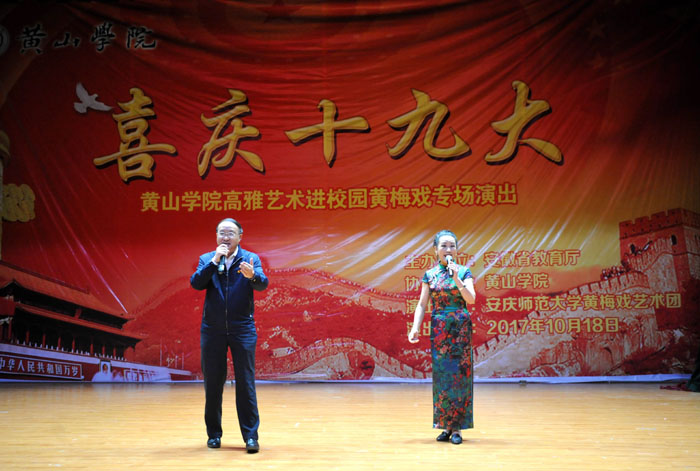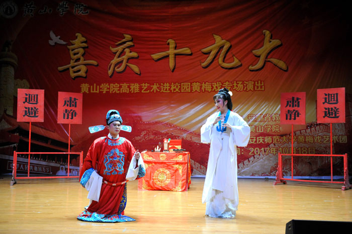 10月18日晚,在举世瞩目的中国共产党第十九次全国代表大会隆重开幕之际,“喜庆十九大”之高雅艺术进校园黄梅戏专场演出在我校大学生活动中心礼堂隆重上演。校党委委员、副校长胡家俊,安庆师范大学黄梅剧艺术学院院长荀安华,有关部门、学院负责人以及师生员工代表1000多人观看了演出。