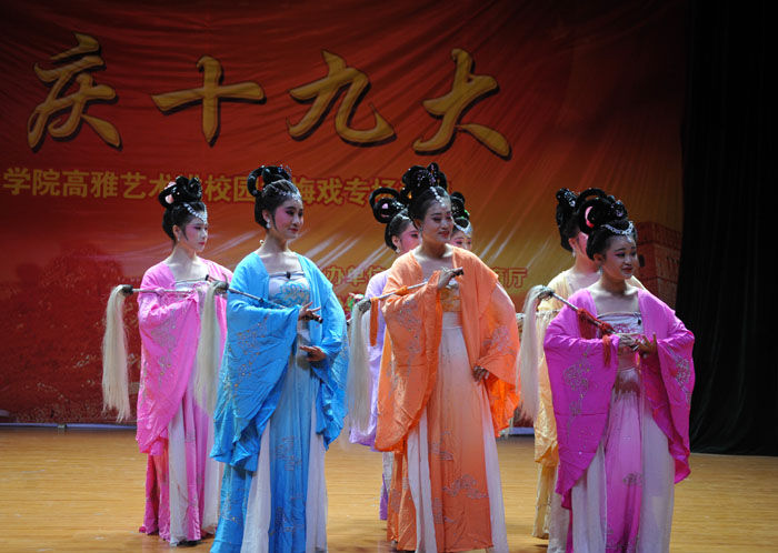 整场演出由8个节目组成,直观地展示黄梅戏的声腔美、音乐美、服饰美和妆容美,给我校师生带来了一场视听盛宴。开场表演的《天仙配》经典片段《鹊桥》,通过优美的唱词,恰当的板腔,表达了七仙女对人间生活的羡慕和向往;《路遇》描述了黄梅戏的代表人物——董永与七仙女的故事,故事经典,让人回味无穷;《昭君出塞》鼓点铿锵、扣人心弦,通过昭君出塞前的内心独白,描述了她肩负和平使命的责任担当;《忆十八》唱词委婉,再现了相依相伴的同窗之情;《扈家庄》通过舞伴歌,表现了扈三娘的武艺高强、机智擒贼;《天女散花》中的七仙女身着七彩霓裳,似真似幻,全场掌声不断;经典折子戏《三两劝廉》通过跌宕起伏的情节,引导青年学生从善如流、清廉如水;《打猪草》《闹花灯》等经典曲目让在座师生不禁和唱起来;演出在文化与传播学院党总支书记汪家庚与郭霄珍的对唱《夫妻双双把家还》中达到高潮。
