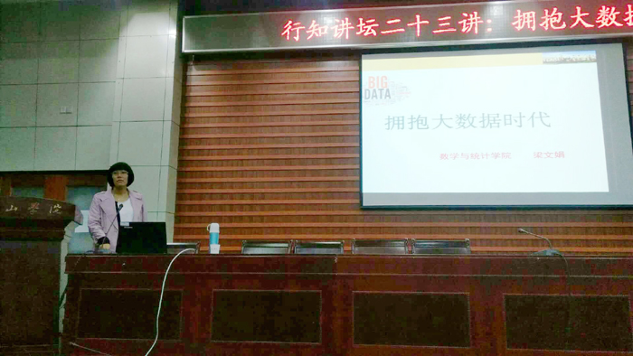11月2日晚上,我校“行知讲坛”第二十三讲在南区图书馆二楼报告厅举行,数学与统计学院教师梁文娟作题为“拥抱大数据时代”的学术报告。数学与统计学院、科研处近300名师生参加了报告。
