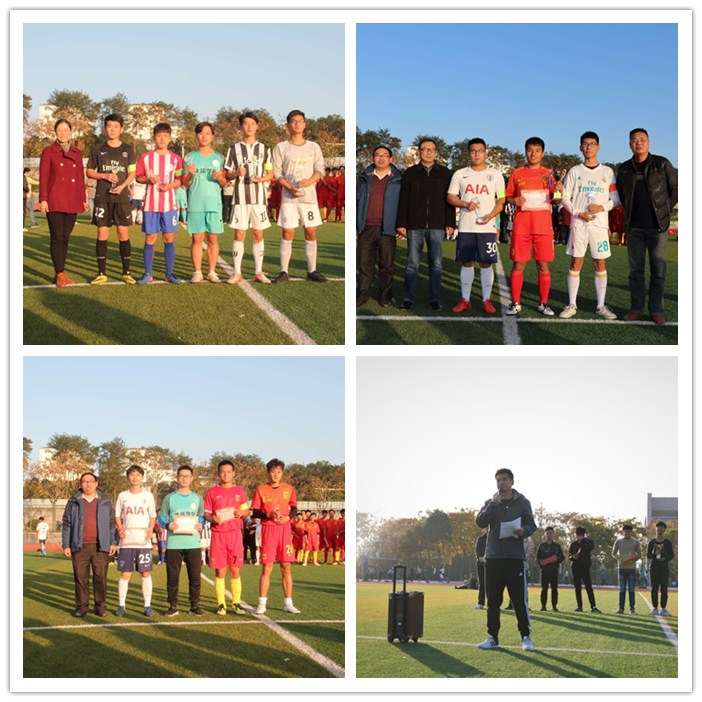 11月26下午,由校学生足球协会(筹)组织的校2017年学生足球联赛在南区第二塑胶运动场圆满落幕,并举行了颁奖仪式,裁判长、体育学院足球教师郑代义宣读了各队比赛成绩及最佳裁判、最佳球员、最佳射手、最佳门将和优秀球员获得者名单,学生处处长李庆玖、团委副书记邱慧、保卫处副处长窦卉平、体育学院党总支副书记杨和健等为获得球队和获奖运动员颁发了奖杯、荣誉证书。