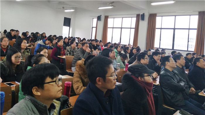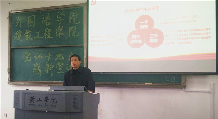 12月13日下午,校党委委员、 副校长刘英旺在外语楼多媒体三教室为外国语学院、建筑工程学院师生宣讲党的十九大精神。外国语学院和建筑工程学院党政领导、全体教师、学生党员及入党积极分子代表近200人参加宣讲会。