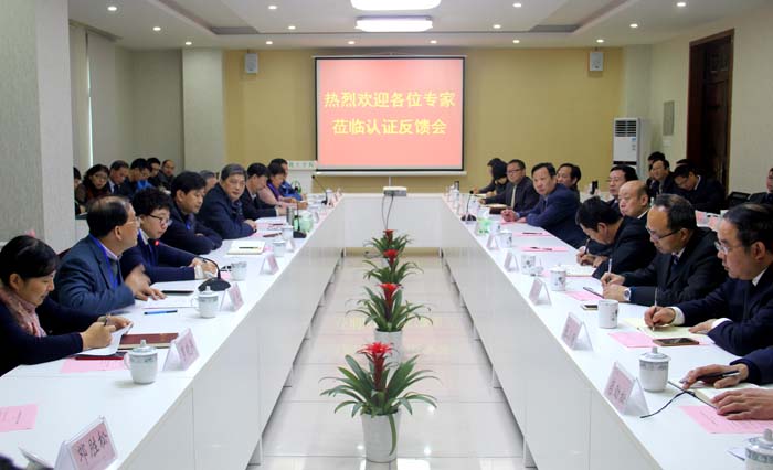12月16日上午,以华东理工大学药学院院长宋恭华教授为组长的全国药学类制药工程专业认证现场考察专家组一行11人结束了对我校制药工程专业进行为期3天的专业认证现场考察工作。当日上午10时,我校制药工程专业认证专家意见反馈会在化学化工学院会议室举行。校党委书记汪枫,党委委员、副校长胡家俊,副校长胡善风,各职能部门及二级学院负责人,校教学督导组成员,化学化工学院各专业负责人、骨干教师参加了会议。反馈会由宋恭华主持。