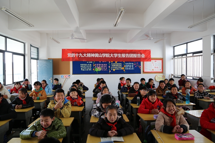 校内报告会如火如荼开展之际,大学生报告团还受邀走出去为周边的中小学服务。报告团于12月20日下午前往屯溪龙山实验小学和昱城中学对学生进行宣讲。在小学,报告团通过动漫和问答的方式来宣扬十九大精神,一些小朋友年龄虽小但对十九大了解很多,参与活动热情高涨。校学生会主席、青年研习社社长奚晓飞在宣讲中从国际地位、经济实力、文化政策等方面向同学们说明了我们有一个强大的祖国,而作为新时代的学子要有理想、有担当、有作为;要时刻树立民族自豪感,为实现中华民族伟大复兴的中国梦而努力学习。