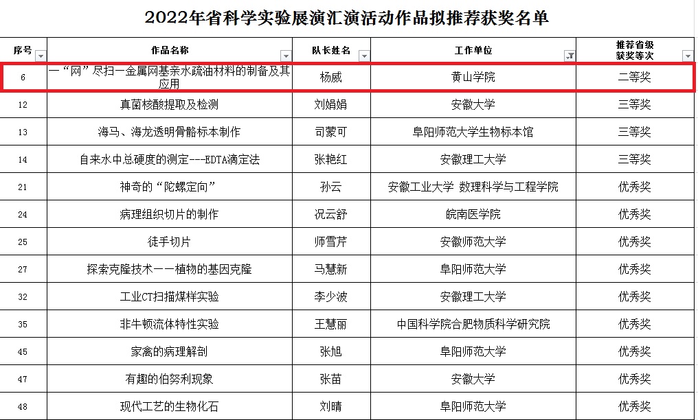 近日,由省科技厅开展的2022年安徽省科普讲解大赛和科学实验展演汇演活动落下帷幕,我校化学化工学院杨威、沈彩云、尹紫寒同学的作品《一“网”尽扫—金属网基亲水疏油材料的制备及其应用》荣获科学实验展演汇演二等奖。