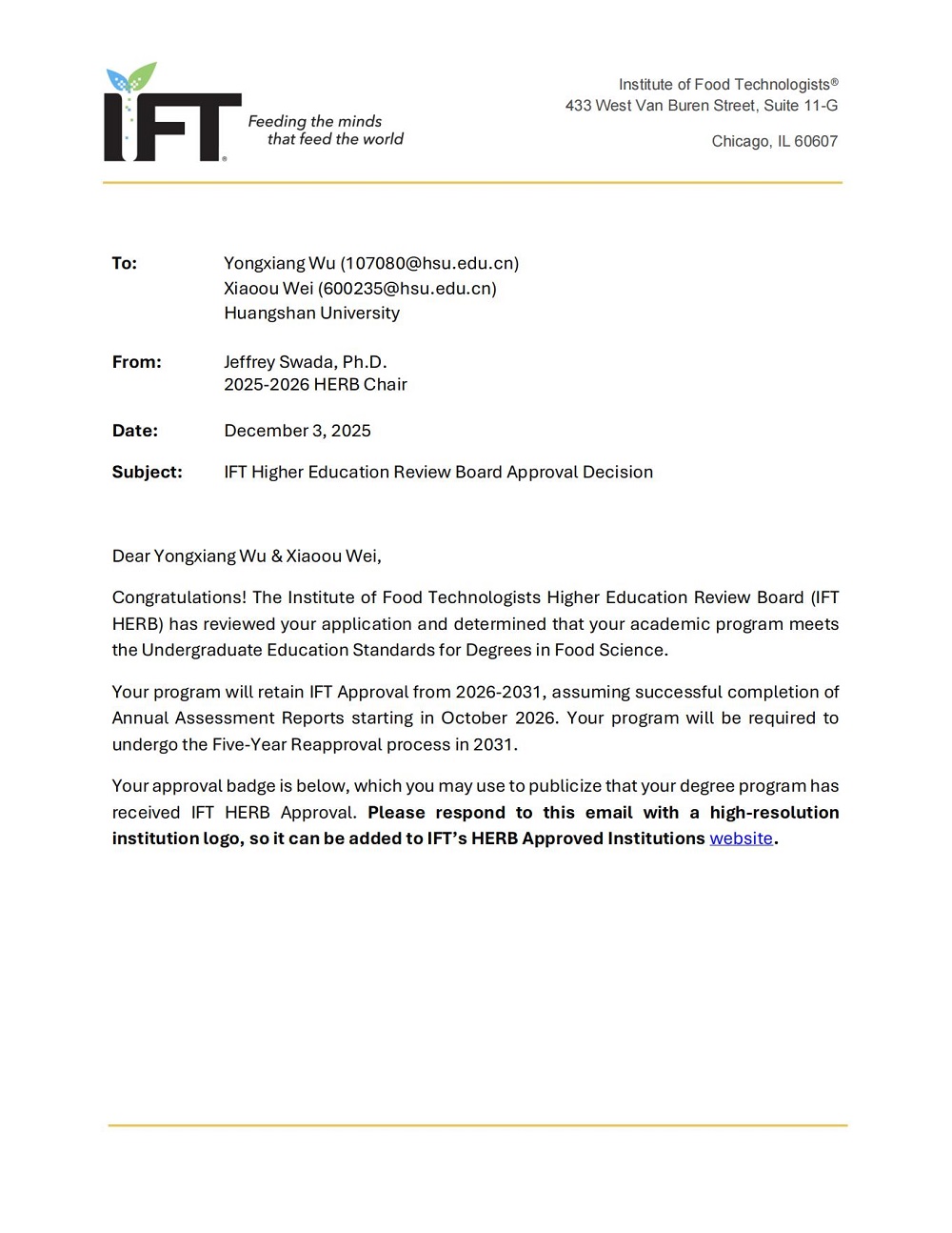 12月5日,美国食品科学技术学会(Institute of Food Technologists,IFT)正式致函我校,黄山学院食品科学与工程专业通过其高等教育认证委员会评审,获得为期五年(2026年-2031年)的满额认证。