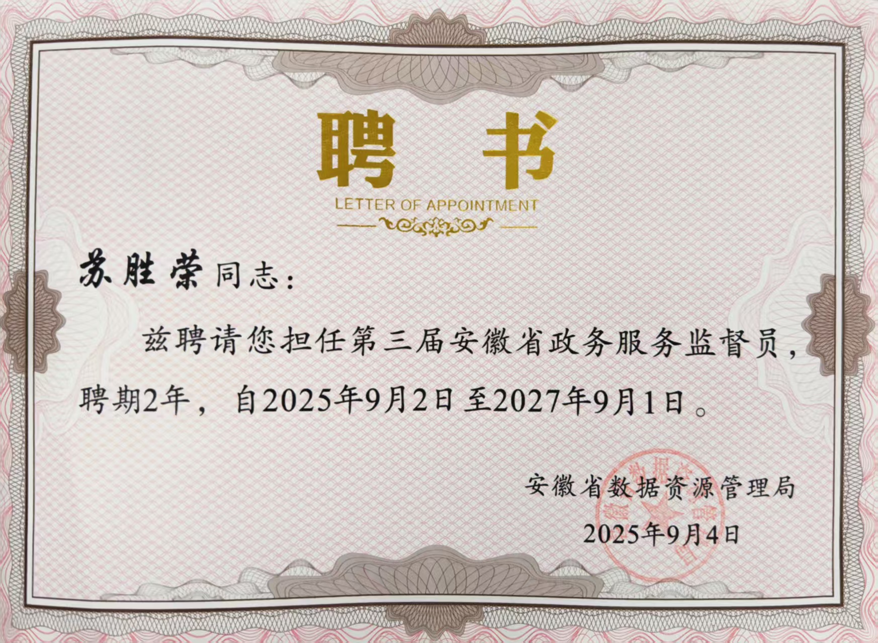 根据《安徽省数据资源管理局关于开展安徽省政务服务监督员换届工作的通知》文件要求,经黄山市数据资源管理局选拔和推荐,九三学社黄山学院支社主委、黄山市第八届政协委员、我校生命与环境科学学院教师苏胜荣被正式聘为2025年安徽省政务服务监督员。