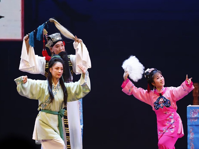 本次演出特邀潜山市黄梅戏剧团,以婉转悠扬的唱腔、细腻传神的表演,展现安徽戏曲的独特韵味。经典黄梅戏《天仙配》中,演员们通过细腻的眼神与灵动的身段将七仙女俯瞰人间时对烟火生活的向往演绎得真切可感。廉政小戏《留余太守》等剧目则立足现实题材,以质朴真切的演绎传递正向价值,引发师生情感共鸣。演员们凭借鲜明的角色塑造与紧凑的表演节奏,展现出不同剧种的多元风格,以水袖翻飞的翩跹身段、丝竹管弦的悠扬韵律,与现场此起彼伏的掌声交织,将传统艺术的生命力与舞台感染力渲染得淋漓尽致。