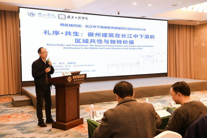 会上,建筑工程学院党委副书记黄炜以《礼序·共生:徽州建筑在长江中下游地区的区域共性与独特价值》为题作专题报告,系统阐释了徽州建筑在区域文化中的共性与特色,并与参会专家展开深入研讨。该院在会场同步展示了近年来在徽派建筑研究、教学与实践方面的成果,得到了与会代表的广泛关注与高度评价。