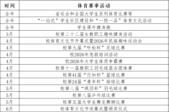 为贯彻落实《教育强国建设规划纲要(2024—2035年)》《关于实施学生体质强健计划的意见》《安徽省实施学生体质强健计划全面推进深化学校体育高质量发展改革试点工作方案》(皖教体〔2026〕1号)等文件精神,进一步提升我校师生体质健康水平,凝练校园体育文化特色,促进校园体育文化繁荣发展,学校定于2026年4月至6月举办体育文化节,具体事宜如下: