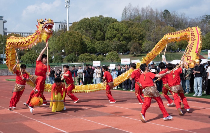开幕式上,校舞龙队献上了精彩的传统体育项目展演《龙腾盛世》,体育学院王庆庆老师带领现场师生共同学习了中华民族传统体育项目——八段锦。
