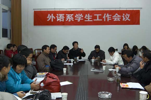 11月18日下午,外语系在四楼会议室召开学生工作会议。校党委副书记李家祥到会指导,校学生处副处长许竞成、李庆玖陪同参加。