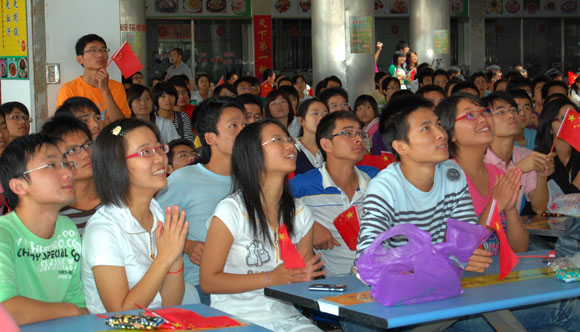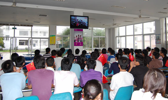 到上午10点,4个会场共两千余座位全被坐满,晚来的同学不得不在食堂和报告厅的空地站着观看。当胡锦涛总书记等党和国家领导人登上天安门城楼、出现在电视画面上时,伴随着礼炮轰鸣,各会场上响起阵阵热烈的掌声。大家不由自主全体起立,跟随电视直播高唱《中华人民共和国国歌》。