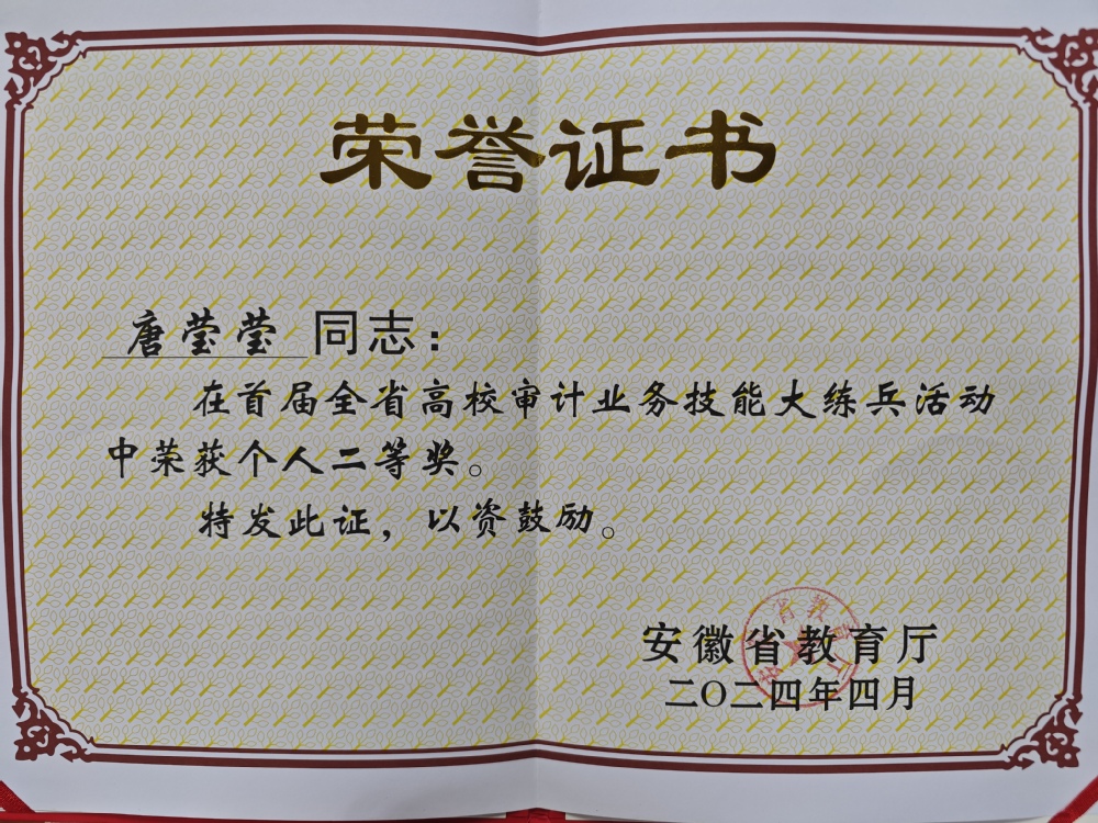 日前,由安徽省教育厅主办、合肥工业大学承办的首届全省高校审计业务技能大练兵决赛在合肥工业大学落下帷幕,我校审计处唐莹莹同志荣获个人二等奖。