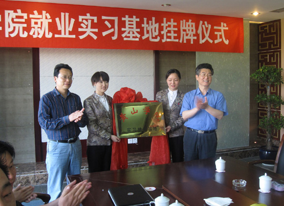 李家祥和马光飞为“黄山学院实习就业基地”揭牌,庄丹娅和马光飞代表校企双方在协议书上签字。
