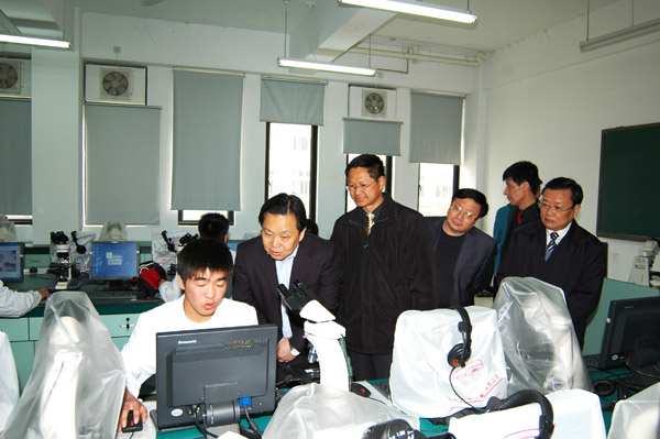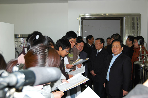 王福宏一行在校党委书记汪良发,院长汪建利,党委副书记李家祥,党委委员、办公室主任胡家俊等陪同下沿途视察了听松湖、运动场、校园文化广场、逸夫图书馆等处,深入化学系化工实验室、应用化学研究所,生环学院显微互动实验室、动植物标本实验室进行细致考察。王福宏所到之处,与师生进行亲切交谈,关切询问学生的学习生活情况和教师的科研、工作情况。在生环学院动、植物标本实验室,王福宏一边兴致勃勃地参观陈列的各种标本,一边与校领导和生环学院的吕顺清教授就黄山市的生态资源、水文资源发展等问题进行热烈交流,并不时叮嘱身边的工作人员对一些重要的问题进行认真记录。