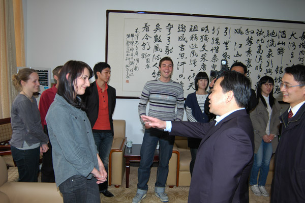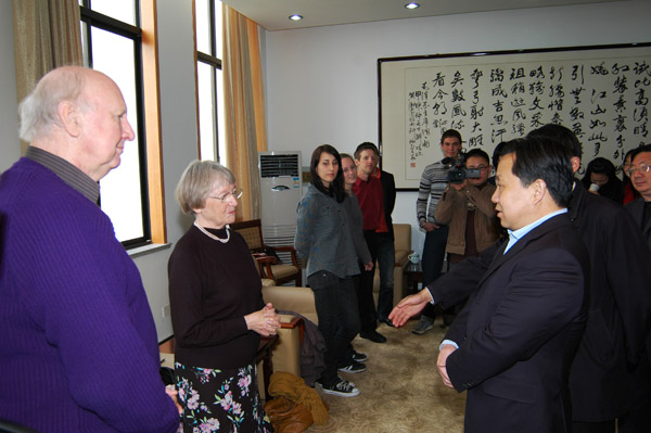 在逸夫图书馆二楼接待室,王福宏热情看望了我校的外国专家和留学生,并与他们合影留念。王福宏感谢三位来自美国的外教对密切中美关系,传承中美友谊所做的贡献,并希望他们介绍更多的朋友来中国、来黄山旅游或工作。他说,黄山是中国最美的地方,黄山属于中国,也属于世界;在与我校韩国留学生交谈时,王福宏说,在中国每年的入境游客中,韩国占40%,很多韩国人也很喜欢黄山。随着大韩航空公司直飞黄山航班的开通,韩国到黄山将更加方便、快捷。王福宏希望我校在工作、生活和学习等方面能给予外国专家和留学生更多关心和帮助。
