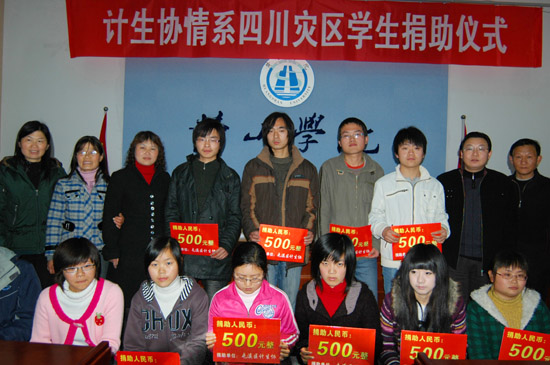 3月12日下午,屯溪区人口和计划生育委员会、屯溪区计划生育协会情系四川灾区学生捐助仪式在我校举行。我校旅游学院王国江等12位同学共获得助学金6000元整。