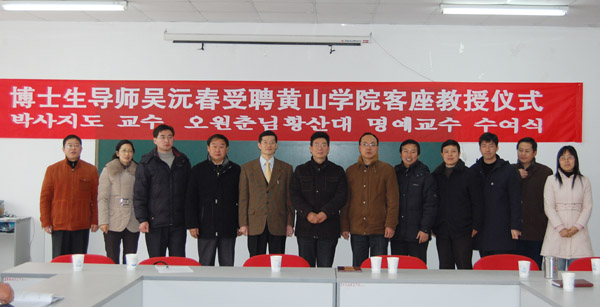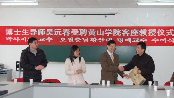 座谈会后举行了吴沅春客座教授受聘仪式,校党委副书记李家祥,外事办、教务处、人事处、科研处、化学系负责人和部分师生出席受聘仪式。李家祥代表学校向吴沅春教授颁发了我校客座教授聘书并发表热情洋溢的讲话,李家祥对吴沅春教授来我校访学并担任我校化学系客座教授表示热烈欢迎和衷心感谢,他指出韩瑞大学与黄山学院已经开始了实际性的合作办学,今年招收了“2+2模式”的两校共同培养的旅游管理专业学生,这仅仅是开始,通过吴沅春教授这次访学考察一定会加深我校与韩瑞大学进一步的合作。吴沅春教授表示非常荣幸地受聘为我校客座教授,愿意为两校的合作办学和学术交流做出努力。