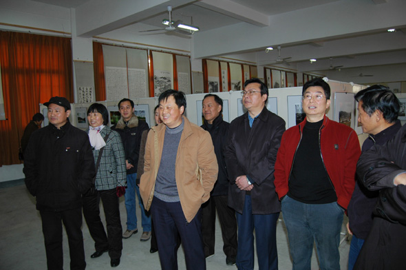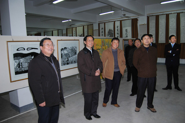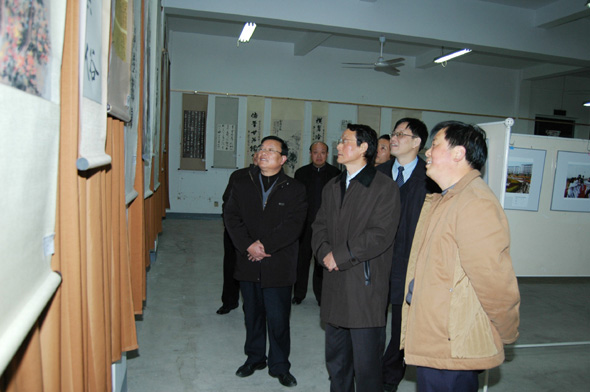 本次书画摄影作品展于11日上午10时开展。院长汪建利,党委副书记李家祥,副院长徐成钢,纪委书记吴邦贵,督导员汪大白,党委委员、办公室主任胡家俊等在党委宣传部、工会、团委、艺术系、离退休处负责人的陪同下观看展览。校领导充分肯定展览结合校园改革、建设、发展取得的成就集中进行形象展示的鲜明特色,并签名题词勉励,与主办部门负责同志合影留念。