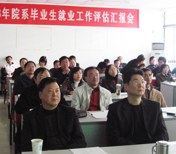 12日下午,评估专家组在化学系会议室听取了各院系2008年院系就业工作评估汇报会。院长汪建利、校党委副书记李家祥出席汇报会并讲话。各院系主要负责人、学生处全体成员以及全体专职辅导员参加了汇报会。汇报会由李家祥主持。全校11个院系就业工作第一责任人以PPT课件形式,按照校就业工作评估指标体系的要求,对本院系毕业生就业工作进行汇报。