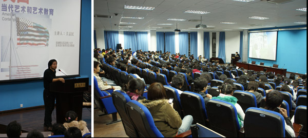 当晚,应艺术系、科研处邀请,关志民为我校300多名师生作学术报告。报告以美国大学美术教育为中心,对于美国现代美术教育的发展和成长给予了深刻的阐述和分析,并就当代大学美术教育发表了自己的看法,开阔了同学们的艺术视野。报告会还通过对美国现当代画家的作品赏析,为当代美术专业的大学生提供和推荐一些具代表性和说服力的发展方向。报告会由艺术系副主任左铁峰主持,系主任周筱华以及美术、设计、动画、音乐等专业教师也参加了报告会。
