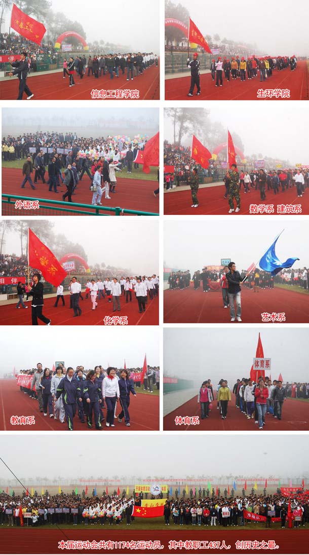仪仗队、裁判员、运动员队伍依次入场。运动会组委会主任委员汪大白副院长致开幕辞。运动员、裁判员代表分别进行了宣誓。汪建利院长宣布运动会开幕。开幕式由体育系副主任李昌军主持。