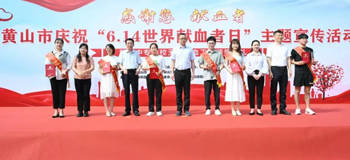 “6.14”是世界献血者日二十周年,为庆祝这一节日,感谢献血者的无偿献血行为,弘扬无偿献血的无私奉献精神,当天,市卫生健康委员会、市红十字会、市教育局、共青团黄山市委员会在昱中花园联合开展“6.14世界献血者日”主题宣传活动暨大中专院校无偿献血工作颁奖典礼。我校荣获2023年度学校无偿献血贡献集体奖二等奖,我校汪春艳老师、周莉莉老师,吴欣荣同学等3名师生荣获2023年度学校无偿献血优秀组织个人。