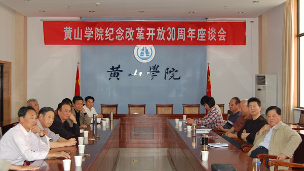 座谈会上,焦启明、叶光立、汪柏树、朱康信、程伟乐、余训言、郁祖权、任良耀等同志先后发言。他们在发言中说,随着1978年党的十一届三中全会的召开,我们党破除了“两个凡是”思想的束缚,重新确立和发展了党的实事求是的思想路线,把党和国家的工作重点转移到了经济建设上来。改革开放的30年,是中国实现从温饱不足到总体小康跨越的30年,是创造了辉煌成就的30年,它为实现中华民族的伟大复兴奠定了坚实的基础。他们结合自身的工作生活经历,回顾了学校刚刚建立时期的艰难创业历程,历数了学校由徽州师专更名转型为黄山高专,由黄山高专升格为黄山学院的办学成就;伴随着改革开放的30年,我校在办学规模、硬件建设、师资队伍建设、学科专业建设、科研水平、工作生活条件等方面都取得了长足的进步,这是校党委正确领导的结果,是全体教职工同心同德、艰苦创业,心往一处想、劲往一处使的结果,是发扬积极向上、敢于争先、勇夺第一的改革创新精神的结果。在展望我校未来发展时,他们说,首届党代会已经提出了符合我校实际的未来5年的发展目标和具体措施,相信在校党委的正确领导下,在全校教职工的共同努力下,坚持改革开放,牢记“两个务必”,不断加强师资队伍建设,不断加强科研工作,就一定能实现黄山学院的稳健发展,创造出黄山学院更加辉煌的明天。