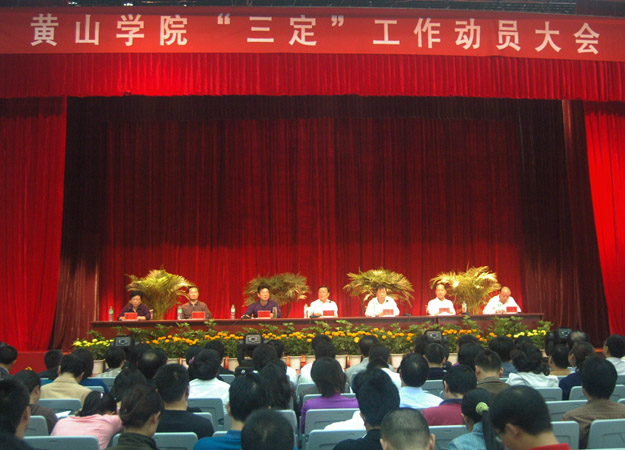 10月8日,我校在大学生活动中心会堂召开“三定”工作动员大会,部署学校下半年“三定”暨全员聘用工作。校党委书记汪良发,党委副书记、院长汪建利,党委副书记李家祥,副院长汪大白,纪委书记吴邦贵,党委委员、校办公室主任胡家俊,党委委员、外语系主任胡一宁出席大会并在主席台就座,全校中级以上职称、副科以上职务人员400人参加大会。大会由李家祥主持。