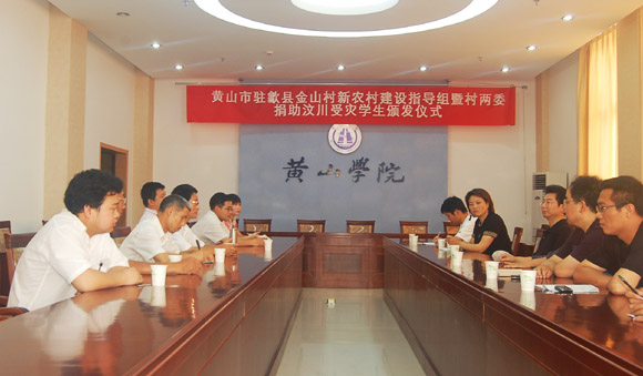 市驻歙县金山村新农村建设指导组代表说,汶川地震牵动着全国人民的心,在得知我校有学生来自地震灾区时,他们积极和我校联系,捐助我校06新闻专业张伟同学未来两年的学杂费用共计人民币10000元。