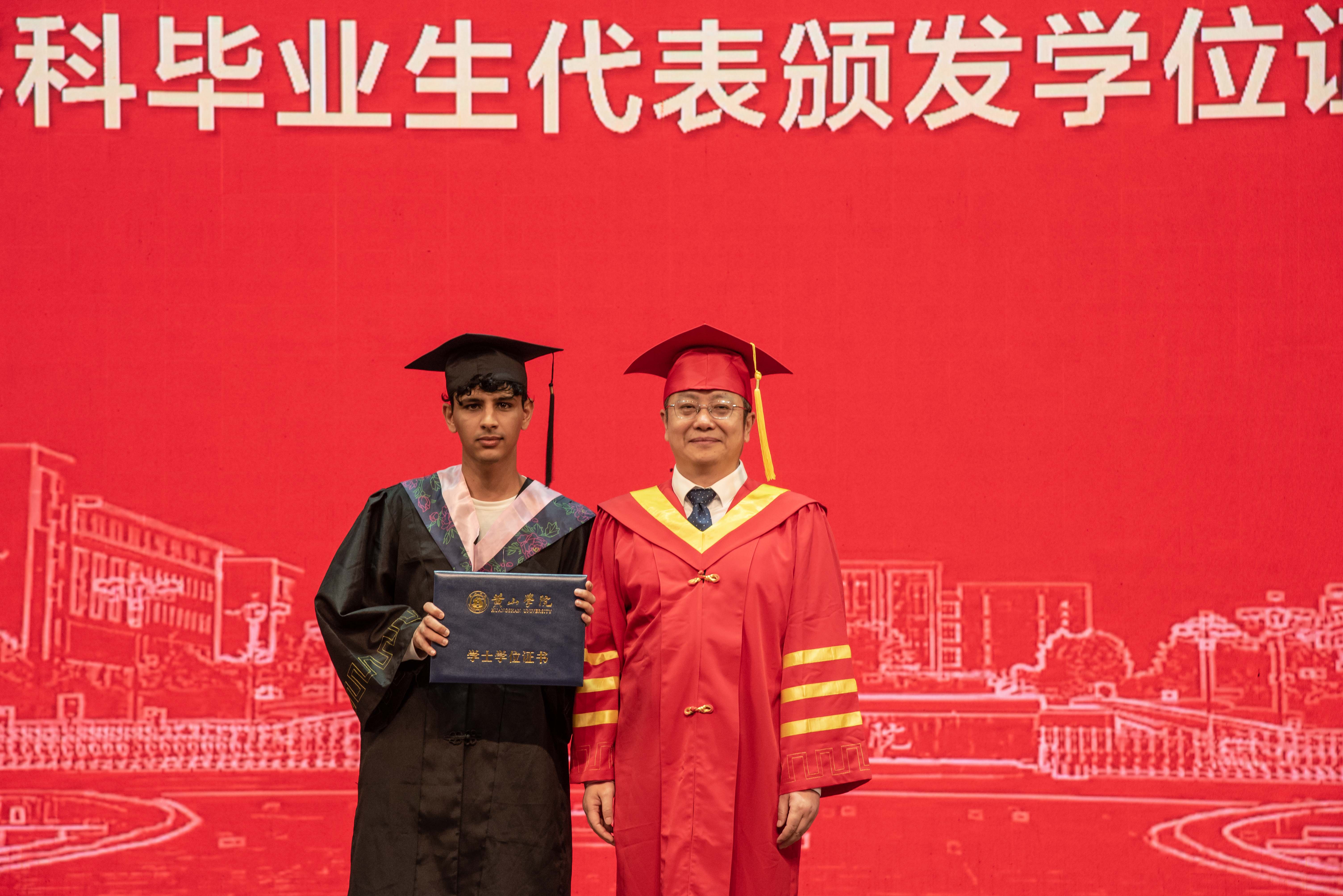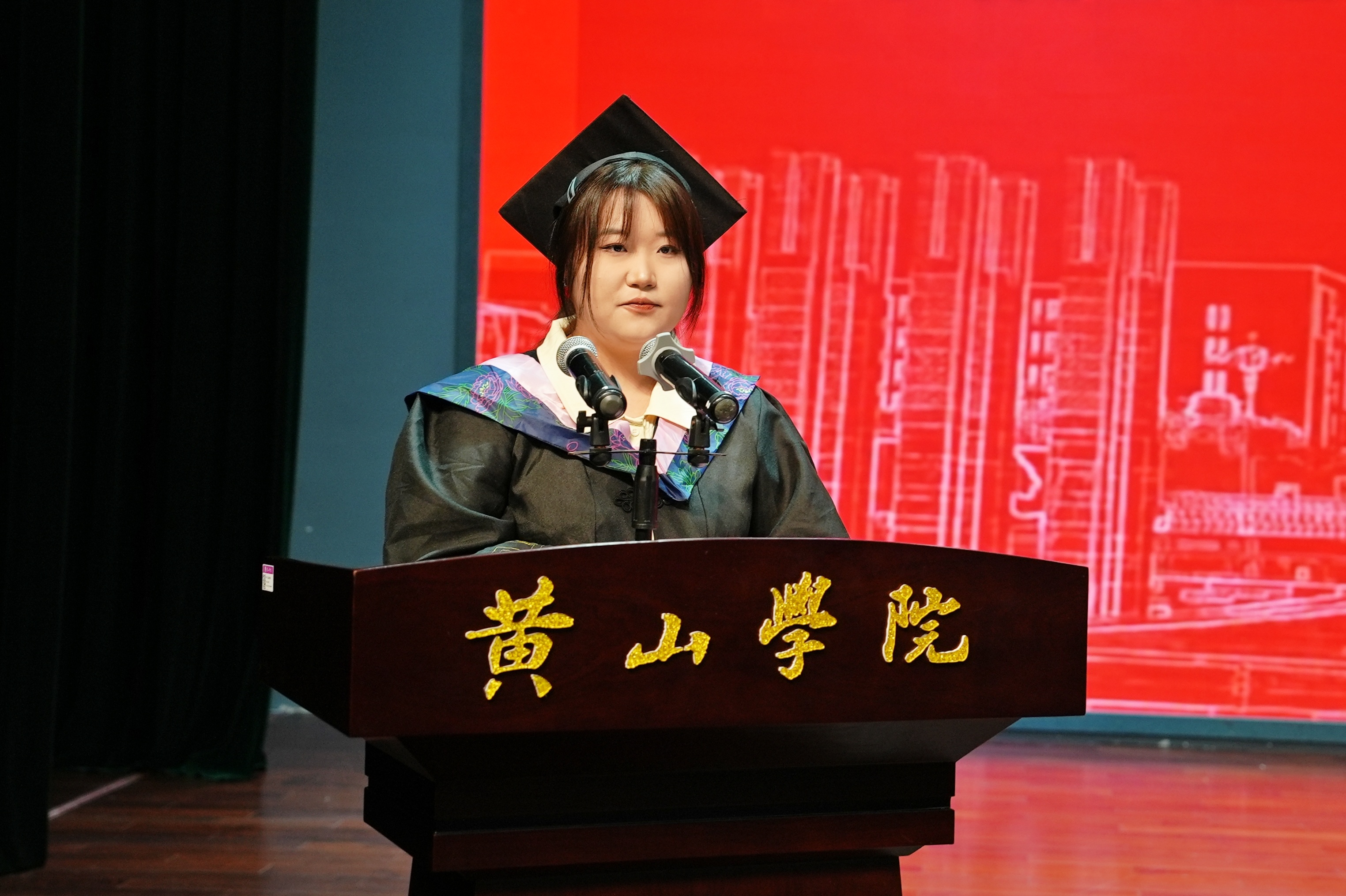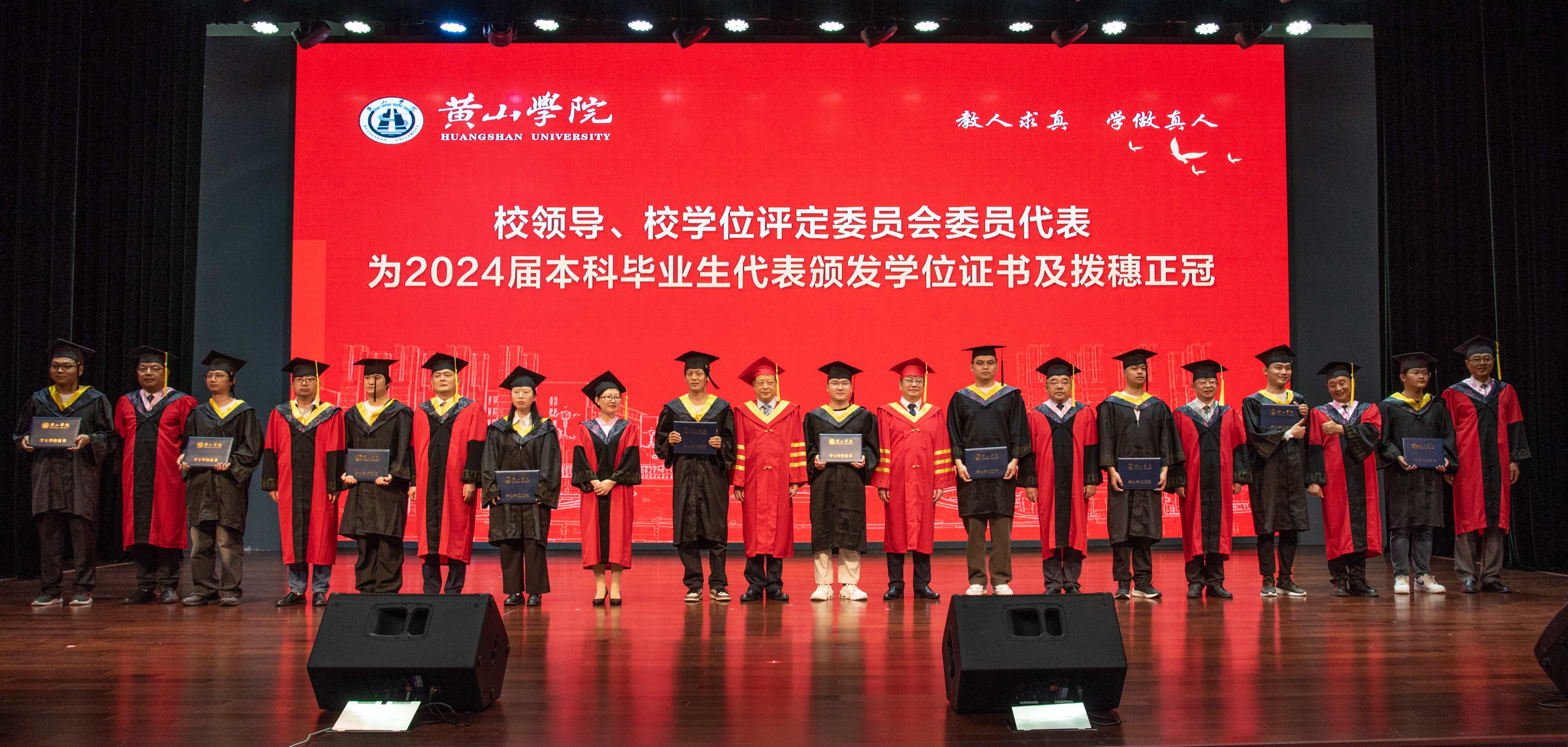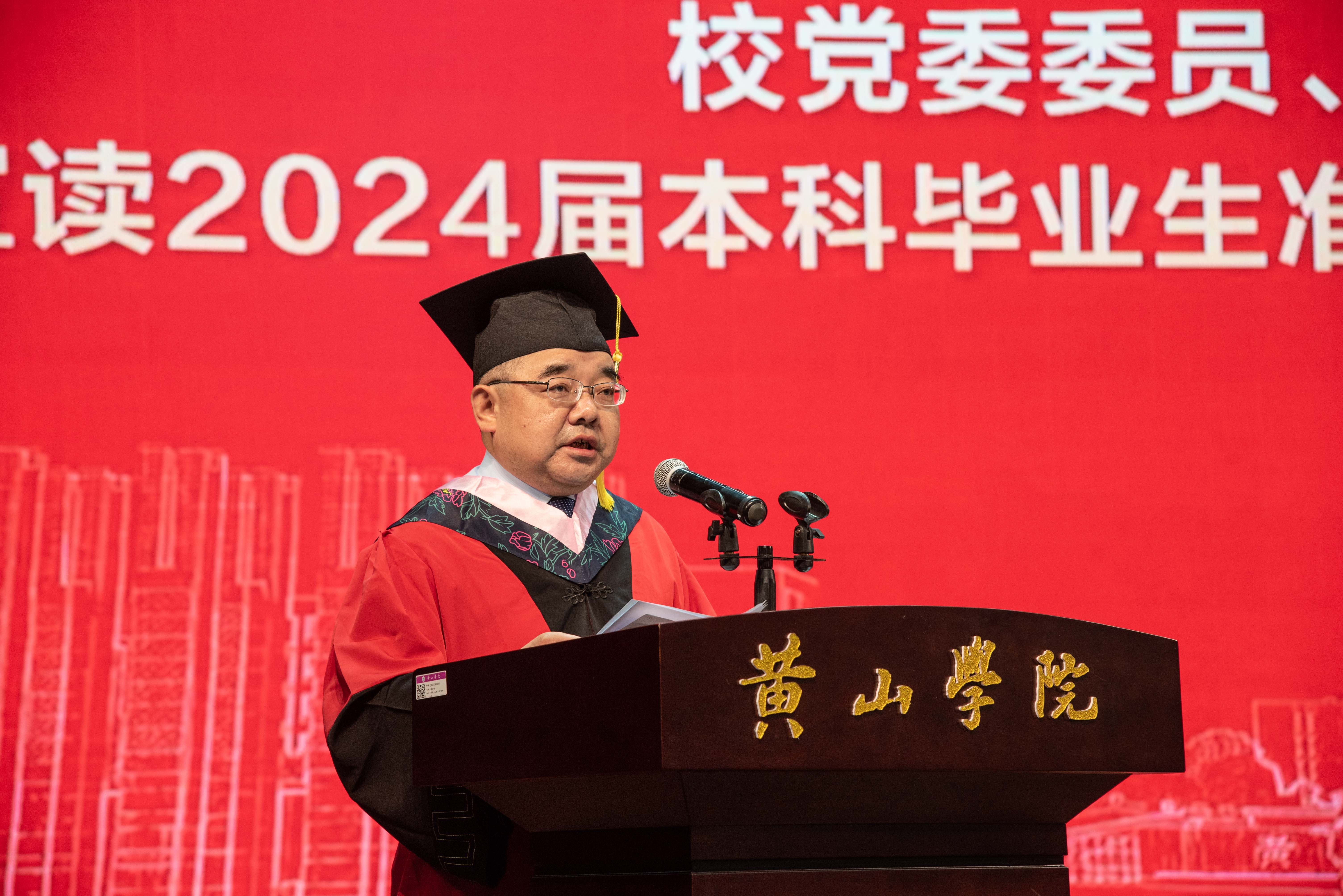 典礼在庄严嘹亮的国歌声中拉开序幕。李铁范代表学校向2024届全体毕业生表示热烈的祝贺和诚挚的祝福!向辛勤养育他们的父母、倾心培养他们的老师、为他们成长默默付出的全体教职员工致以衷心的感谢和崇高的敬意!他带领大家深情回顾四年来同学们和黄山学院共同成长的难忘岁月。