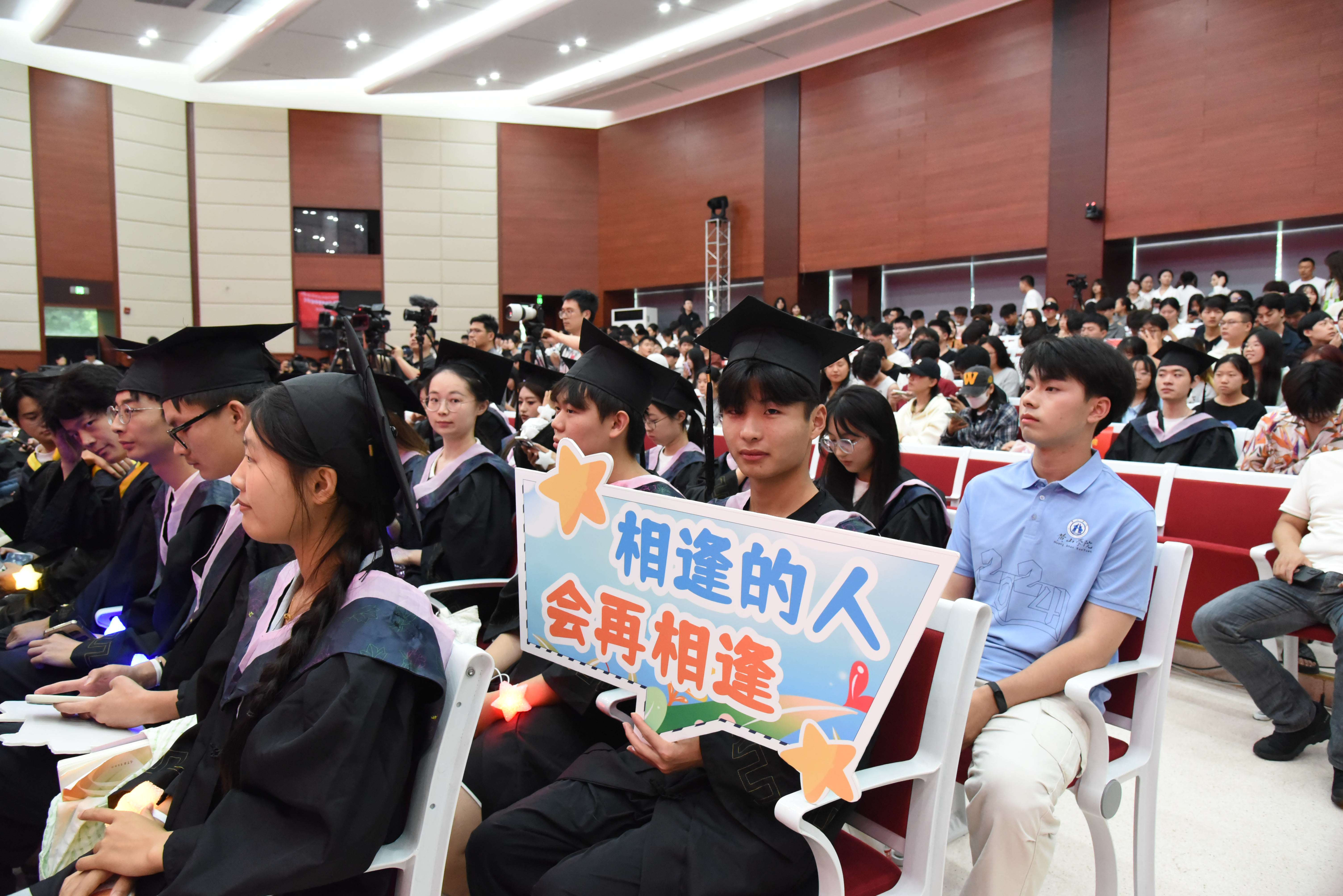 “你总说毕业遥遥无期,转眼就各奔东西”“好想沿着回忆狂奔向你昨日的青空”……依依惜别离校园,深深情谊留心间。黄山学院往届毕业生代表、2014届应用化学专业毕业生凌雨晴,2020届播音与主持艺术专业毕业生赵阳,2023届社会体育指导与管理专业毕业生谷安南以及8位在校学生带来了毕业歌曲串烧。他们带领大家用歌声细数这些年的点滴往事,在动听的旋律中重温每一个美丽的瞬间。现场气氛热烈,掌声和欢呼声此起彼伏。随后,大屏幕播放献给2024届毕业生的纪念短片《年华似水青春万岁》,带领毕业生追忆青葱岁月,回顾同学们与学校共同成长的轨迹。