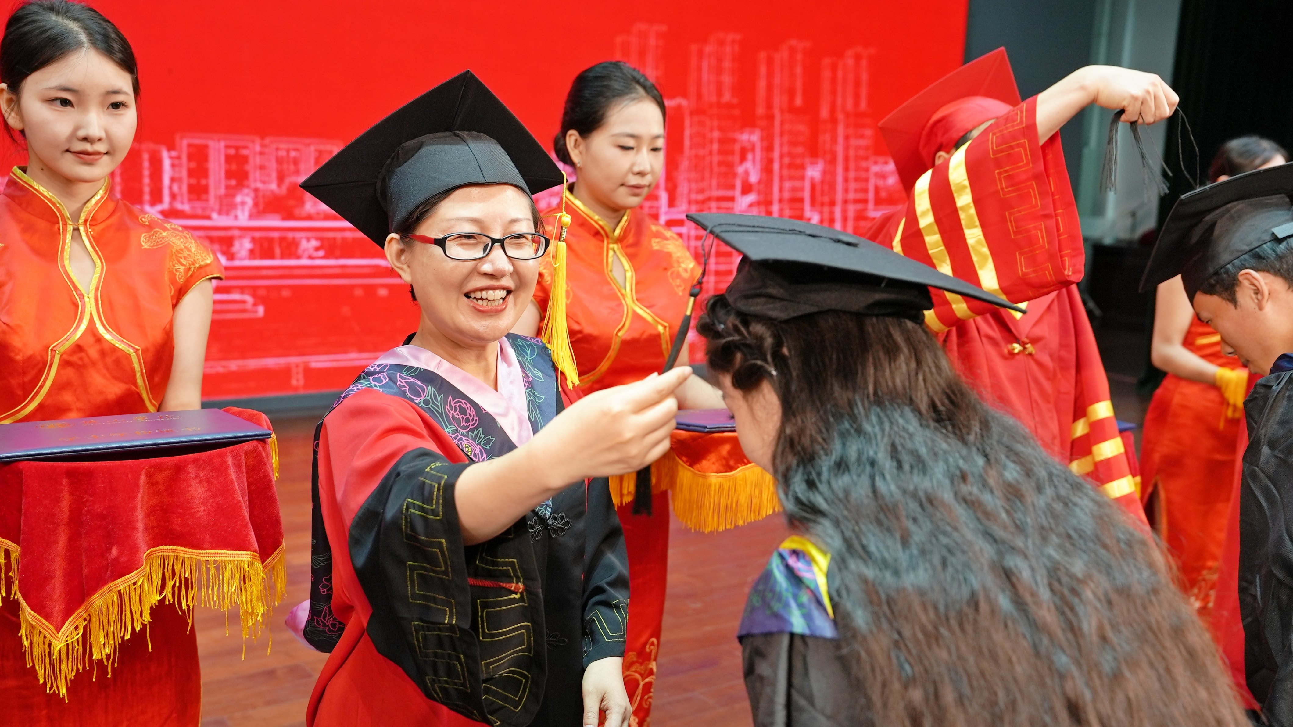 校领导、校学位评定委员会委员代表为2024届毕业生代表拨正流苏、颁发学位证书、授予学位。2024届毕业生代表依次上台,握手、拨穗、正冠、授证、合影……每一个瞬间都是学子们成长中的光荣时刻。