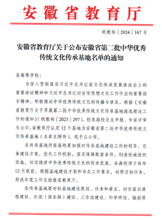 6月15日,安徽省教育厅印发《关于公布安徽省第二批中华优秀传统文化传承基地名单的通知》,我校艺术学院申报的“徽州传统漆艺”获批中华优秀传统文化传承基地。